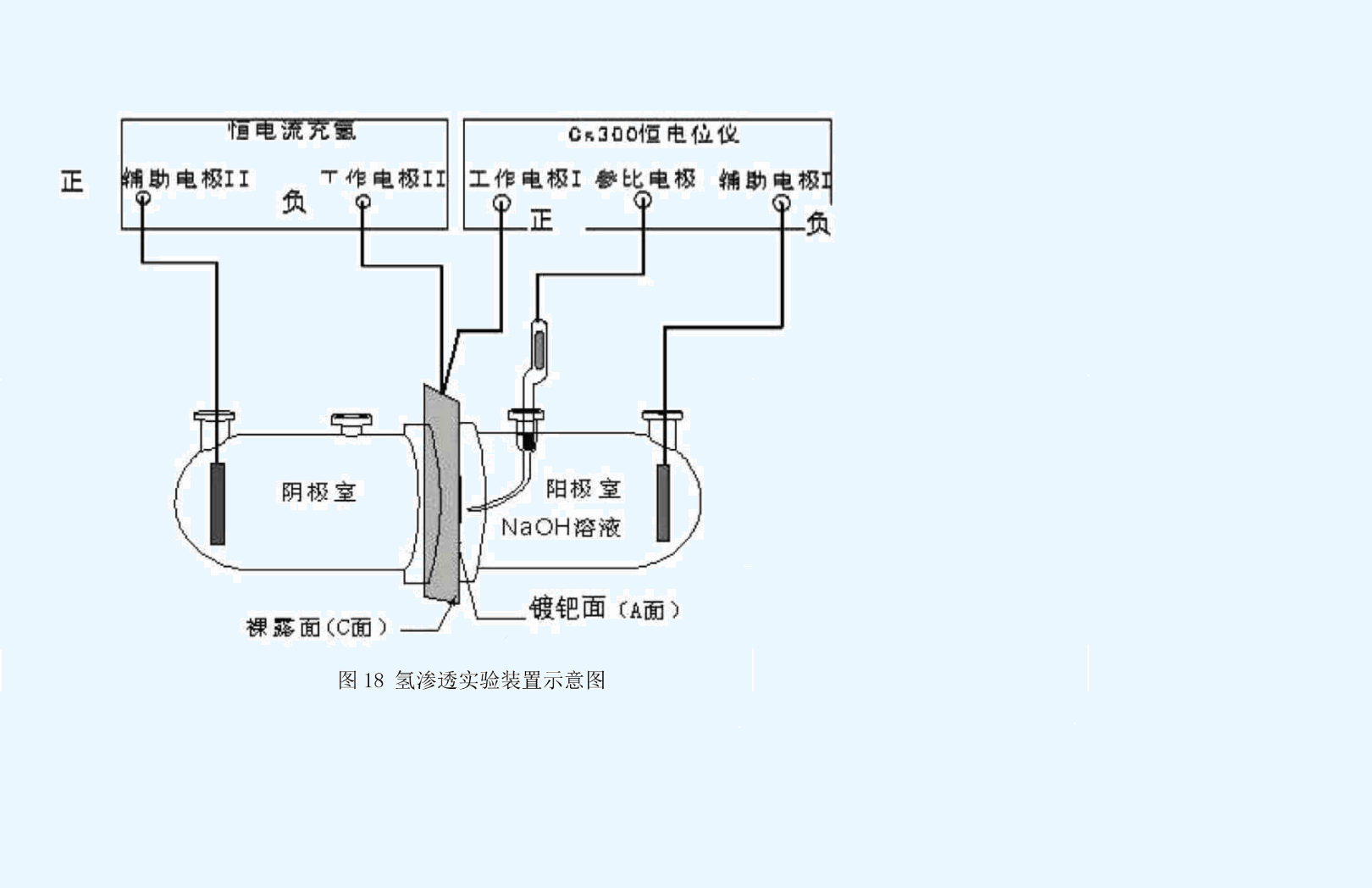 将试样放在如图18所示的氢渗透测量装置的阴阳极中间并固定,在左右两个电解池中各加入200ml 左右0.1mol/L 的 NaOH 溶液。试样两边是两个不相通的电 解池。左边是充氢池,电解充氢时